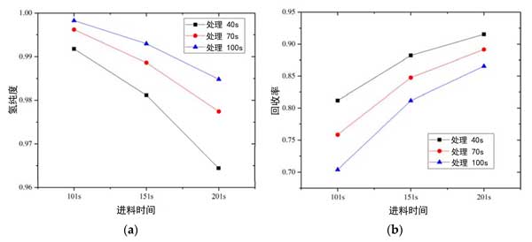 活性炭凈化時間的影響如圖2所示。當吹掃時間從40秒增加到70秒時,氫氣純度提高了0.44–1.35%,氫氣回收率降低了2.61–6.57%。當吹掃時間從70秒增加到100秒時,氫氣純度提高了0.21-0.76%,氫氣回收率降低了2.91-7.19%。隨著吹掃時間的增加,在吹掃步驟中氫氣的摩爾分數(shù)增加,因為更多的不純氣體從吸附劑中解吸出來。因此,隨著吸附劑的循環(huán)利用,這些雜質的摩爾分數(shù)降低,因此隨著凈化時間的增加,氫純度也隨之提高。但是回收率下降了,當進料時間短并且吹掃時間增加時,氫純度變化率降低,并且氫回收率變化率增加。